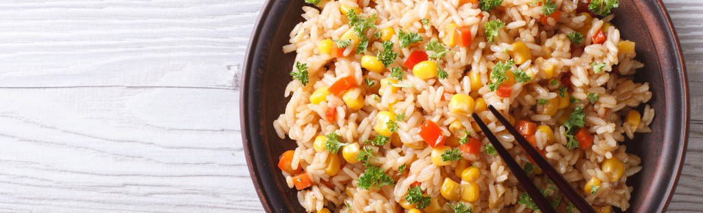 Fried rice with batter and deep-fried marinated pork and fresh vegetables, served with sweet and sour sauce and pineapple.